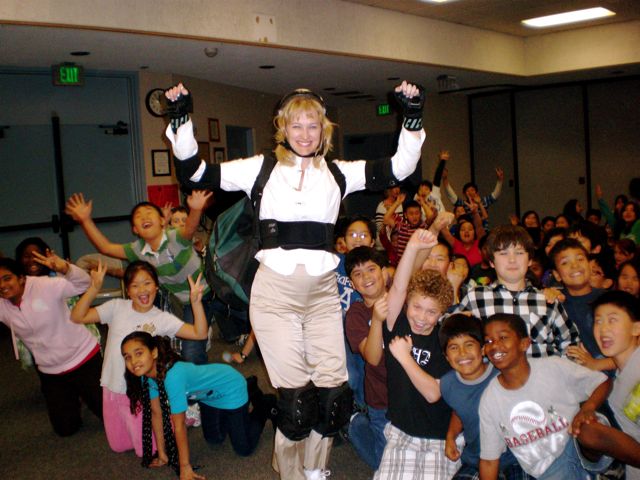 Depending on the age and stage of audience members, I might include a few words on my former life as a Los Angeles Times sports reporter, or the year I spent writing travel stories while backpacking around the world. As a middle-aged woman who rides a skateboard, I enjoy demonstrating how stereotypes are not to be believed! Of course, I top off every show with a few skateboard tricks--indoors or out.